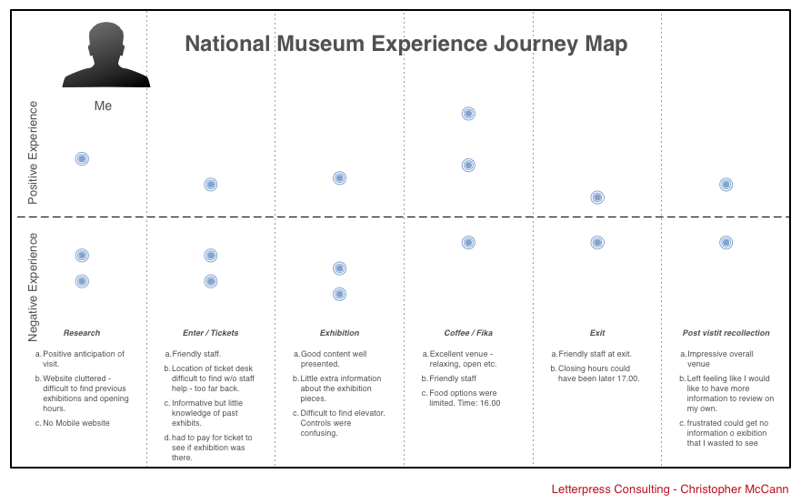 Last week I met with up with my friend Kajsa Hartig that works as a Digital Navigator at Nordiska Museet in Stockholm. We had been trying to link up and visit the Swedish National Museum that is going to be remodeled and had an exhibition that highlighted a large interactive touch screen based exhibition about the remodel of the museum (we thought). We picked a date and visited the museum but sadly the exhibition was no longer being showed. This is what we deduced, since no one seemed to have any recollection of the exhibition despite me reading an article in the Swedish newspaper describing it. I found the entire visit a bit frustrating but things were saved by a good cup of coffee and chat with Kajsa. During the conversation, I explained to her I was confused over that so many museums seem to miss some basic elements when people visit them. The trend from physical ownership to access via technology is something that is increasing (cars, music etc) but yet museums have been dealing with this for years in that they display very valuable and rare objects. A key part of having access to these objects is insuring that the user experience is at a high level. We started discussing this issue further and I began to describe my recent experience working Customer Journey Mapping. I felt this technique could be very valuable in the museum world. I began sketching my experience as I prepared for todays visit and the events that followed in order to demonstrate the key points.